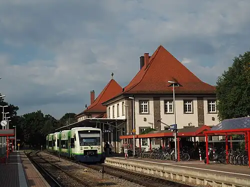 Some tracks have been dismantled. At the beginning of the nineties there were at least four storage and loading tracks. The Kaiserstuhl Railway originally had its own station northeast of the current tracks, to the east of the station building. The company's own line was abandoned in 1960 and the line from Riegel merged with the Deutsche Bunderbahn line from Freiburg at line-km 25.89. The Kaiserstuhl Railway still had a separate departure platform for passenger trains to the northeast of the station building on the north side of the house platform. It had its own crossing loop and there were also two sidings and a siding serving businesses on Kandelstrasse.[8]