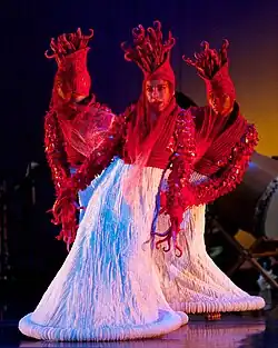 Aoki and Izu created Mermaid following the birth of their son, Kai Kane. Research led her to the conclusion that all cultures have legends of mermaids because all humans begin as mermaids swimming in their mother's womb.[29] This work was based on the Japanese proverb "eat the flesh of a mermaid and you'll live forever."[9] Mermaid was commissioned in 1997 by Maestro Kent Nagano and the Berkeley Symphony. It is a blend of Western theatricality with Japanese Noh and Kyogen drama backed by combinations of Eastern and Western musical instruments.[30] In 2023, Aoki debuted a new multi-media piece about the city of San Francisco, directed by David Furumoto and developed during the COVID-19 pandemic.[31]