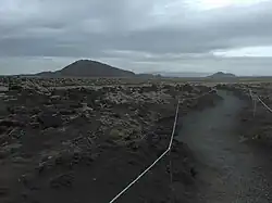 One of the bigger lava flows of the system run south from Brennisteinsfjöll to the coast at Herdísarvík bay forming lava falls on their way.[10] Previously it was thought that this lava flow had ceased before the settlement of Iceland (i.e. the end of the 8th century), but this is now thought that this was not the case as the coastal trail (now Route 42) was covered in lava at one stage.