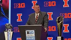On December 19, 2020, Bielema was announced as the next head coach at the University of Illinois Urbana–Champaign, succeeding Lovie Smith.[70] The school said Bielema would receive a six-year contract that paid $4.2 million the first year, with annual raises, based on performance and fulfilling media and other promotional obligations for the program throughout the contract.[71] The salary made him the ninth-highest paid head coach among the then fourteen members of the Big Ten Conference.