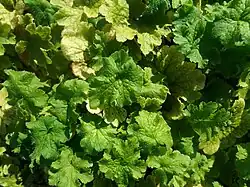 It is a rhizomatous perennial herb growing up to about 35 or 40 centimeters tall. The leaves occur around the base of the stem. They have oval blades up to 5 centimeters wide with toothed, lobed edges. The erect inflorescence bears several flowers, generally 20 to 60, usually along one side of the stem. The distinctive flower is saucer-shaped with five greenish yellow petals which are divided into narrow, whisker-like lobes. The petiole is between 1.2 and 8 centimeters long. There are no cauline leaves. The 1 to 3 inflorescences with between 20 and 60 flowers per node. The pedicles are between 1 and 2 millimeters long. The seeds are either reddish-brown or blackish in color.[3] The fruit type is a capsule. The bloom color is either yellow or green.[4] The bloom period is between the months of April, May, and June.[5]