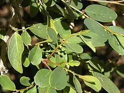 This native shrub may be confused with Senna species which are found in similar habitats, but Senna has pinnate leaves (leaf is divided into separate leaflets and a petiole) unlike the simple leaves of B. oblongifolia, and Senna produces conspicuous yellow flowers followed by leguminous pods in contrast to the inconspicuous flowers and red berries of B. oblongifolia.