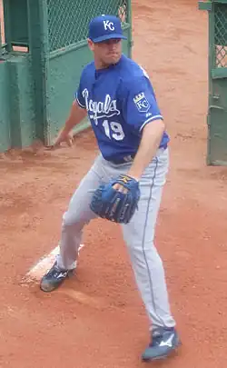 On February 4, 2009, Bannister signed a one-year, $1.7375 million contract with the Royals, avoiding arbitration.[31] On April 1, he was assigned to the Triple-A Omaha Royals to begin the 2009 season.[32] He was called up on April 22 to fill the number-five spot in the rotation, and tossed six shutout innings in his return that day against the Cleveland Indians.[33] After adding a new changeup to his repertoire, his ground ball rate increased and he had a 7–7 record and a 3.59 ERA into early August, ranking in the Top 10 in the American League in ERA and being the subject of numerous trade deadline rumors.[34] Unfortunately, he suffered a season-ending right rotator cuff tear in a 117-pitch game August 2 against Tampa Bay.[35][36] After attempting to pitch with the injury and losing five consecutive starts, he was placed on the disabled list for the rest of the season in early September.[34][36] He finished the year compiling a record of 7–12 with a 4.73 ERA in 26 starts.[18]