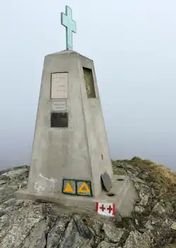 The mountain stands on the Adriatic / Ligurian drainage divide between Passo del Faiallo and Passo del Turchino. It belongs to the province of Genoa, in Liguria. Its summit is a tripoint at which the valleys of Cerusa, Orba and Stura di Ovada meet.[4] Sella Bernè (894 m) divides Bric del Dente from the neighbouring Monte Giallo (at East, 969 m), while a saddle at 931 m divides it from Monte Reixa (westwards, 1183 m). The top of the mountain is marked by a memorial pillar overlooked by a small summit cross.