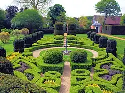 Bridge End Gardens were built part on fields and previous garden on the edge of Saffron Walden and covers an area of 2.7 hectares (7 acres).[2][3] The area was set out as gardens from around 1828 by Atkinson Francis Gibson and his wife Elizabeth.[2] From 1838, his son Francis Gibson – who, as a Quaker, was interested in horticulture[3] and had also completed a garden design for his sister – began creating a new garden with the help of a local nurseryman William Chater (breeder of Chater Hollyhocks).[4][5] Gibson considered the Dutch garden to be of utmost importance, and as such should be visible to visitors as they enter.[3] The hedge maze (based upon the layout of the maze at Hampton Court Palace) was planted around 1870, and restored in 1984 with 11,000 yew seedlings,[5] by which stage the garden was under the management of a local agent and was used as a venue for shows by the Saffron Walden horticultural society.[1]