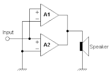 A bridge-tied load (BTL), also known as bridged transformerless and bridged mono, is an output configuration for audio amplifiers, a form of impedance bridging used mainly in professional audio & car applications.[1] The two channels of a stereo amplifier are fed the same monaural audio signal, with one channel's electrical polarity reversed. A loudspeaker is connected between the two amplifier outputs, bridging the output terminals. This doubles the available voltage swing at the load compared with the same amplifier used without bridging. The configuration is most often used for subwoofers.[2]