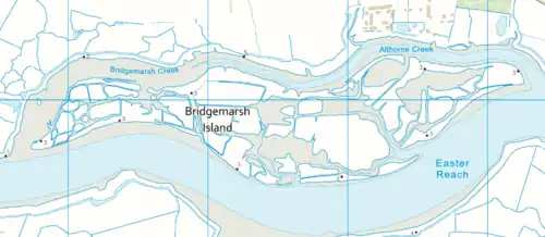 Bridgemarsh Island is in the tidal part of the River Crouch in the English county of Essex, three miles upstream from Burnham-on-Crouch. The main river channel runs to the south between the island and Canewdon, and it is separated from the mainland to the north by Bridgemarsh and Althorne Creeks, channels of the estuary.