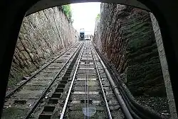 The Bridgnorth Cliff Railway, also known as the Bridgnorth Funicular Railway or Castle Hill Railway, is a funicular railway in the town of Bridgnorth in the English county of Shropshire. The line links the Low Town of Bridgnorth, adjacent to the River Severn, with the High Town, adjacent to the ruins of Bridgnorth Castle. The line is one of four funicular railways in the UK built to the same basic design (the others were the Clifton Rocks Railway in Bristol; the Lynton and Lynmouth Cliff Railway in Devon; and the Constitution Hill Railway in Aberystwyth, Wales). With a maximum gradient of 64% it is one of the steepest railways in the country.