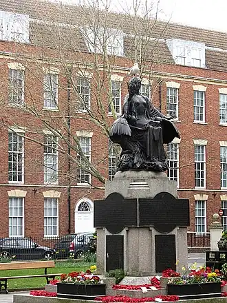 Bridgwater War Memorial is a Grade II* listed[1] war memorial located on King Square in Bridgwater, Somerset, England, on the site previously occupied by Bridgwater Castle. It was designed by John Angel in the mid-1920s.[2][3] The green figure of the memorial is allegorical,[4] representing "Civilization as a seated female, holding a globe in one hand and with the book of knowledge on her lap."[5]