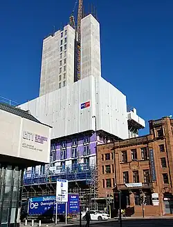 Development and construction firm Watkin Jones Group was granted the contract to construct the building.[9] Construction began on 15 July 2019, with Watkin Jones Group, based in Wales, appointed to carry out and oversee the development of the structure.[10] Developer of the construction, Stride Treglown, objected to a number of conditions that Glasgow City Council had placed on the approved application, with a number of exchanges between the developer and Glasgow City Council taking place throughout 2019 with the developer urging the council to discharge a number of conditions.[11]