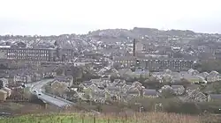 Before the new transport links were constructed, the town was just a scattering of farmhouses forming part of Marsden township known as Little Marsden, which also covered a large part of what was to become Nelson. The land here was considered part of the manor of Ightenhill.[2] The village of Marsden was centred on St Paul's Church just over the boundary with Nelson.[3] Brierfield was likely one of Marsden's town fields,[4] along presumably with Limefield and Mansfield, located within Brierfield parish, and Scholefield and others in Nelson.[3] The older roads in the area connected Marsden with Burnley (Walverden Road), and Haggate (Halifax Road). A branch from latter at Marsden Heights (King's Causeway) descends the valley to cross Pendle Water into Pendle Forest. Chamber Hill next to the river here, was the site of an ancient property known as 'Chamber in Pendle', which belonged to the Radcliffe family of Winmarleigh and descended to Sir Gilbert Gerard in the late-16th century.[2][3]