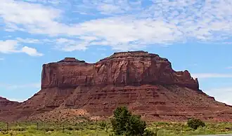 Brighams Tomb is situated six miles (9.7 km) northeast of Oljato–Monument Valley, Utah, on Navajo Nation land. It is an iconic landform of Monument Valley and can be seen from Highway 163. Precipitation runoff from this landform's slopes drains into the San Juan River drainage basin.[3] Topographic relief is significant as the summit rises 1,000 feet (305 meters) above the surrounding terrain in 0.25 mile (0.4 km). The mountain's name refers to Brigham Young,[4] the first governor of the Utah Territory. This landform's toponym was officially adopted/revised in 1988 by the United States Board on Geographic Names after having been officially named "Saddleback" from 1964 through 1987.[1][5] Some older maps will still show the Saddleback name.