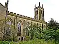St James's Church, which was a chapel of ease for the Parish Church of Saint Martin in Brighouse, opened in 1870, with a congregation of 450. An organ was installed in the same year. Two stained glass windows from the William Morris factory, designed by Edward Burne-Jones were installed in July 1871.[22] Further windows were added at later dates by other designers. In 1900 William Camm[23] the organist paid for the fitting of a window in memory of his mother. A further window to commemorate the curate Rev Alban Bodley Mace (1915), who was killed in action at Salonika during 1916, serving with the Allied Expeditionary Force.[24] The chancel screen was designed by G. H. Woodhouse of Manchester. St James Church was last used on 27 December 1970; and then demolished, with the land used for residential properties. The stained glass windows were removed and taken into the care of the Cliffe Castle Museum in Keighley where they can now be viewed.[25][26]