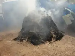 In the third Brahmana, Bhusunda inquires about the method of making sacred ash. The characteristics of the cow whose dung can be used are listed. Dung of brown cow is considered most appropriate. The urine of a cow is suggested to be mixed in the dung. The rituals of extracting of the dung like worship of cow, collecting the urine and dung from its source before touching the ground and associated mantras are told. The mantras for mixing dung with urine, drying balls of the mixture and burning the dried balls are told. The balls are burnt for three days in a Homa (fire-sacrifice), which is fuelled with corn chaff. On fourth day, the ash is extracted and mixed with perfume water or cow urine and various powders like sandalwood, kumkum and so forth. Finally, cakes of this mixture are dried and used as Bhasma. Four types of Bhasma which grant salvation are listed. Anukalpa is the result of Agnihotra and Virujanala fire sacrifices. Upakalpa is created by burning dried cow dung from the forest according to the directives of the Grihya Sutra texts. Upopakalpa is made by burning cow dung with cow urine according to the directives of the Kalpa scriptures. Akalpa is obtained from Shiva temples.[6][7]