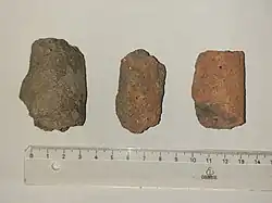 Briquetage or very coarse pottery (VCP[1]) is a coarse ceramic material used to make evaporation vessels and supporting pillars used in extracting salt from brine or seawater.[2] Thick-walled saltpans were filled with saltwater and heated from below until the water had boiled away and salt was left behind. Often, the bulk of the water would be allowed to evaporate in salterns before the concentrated brine was transferred to a smaller briquetage vessel for final reduction. Once only salt was left, the briquetage vessels would have to be broken to remove the valuable commodity for trade.[3] On the European continent, briquetage often took a columnar form which would have two small dimples on each end where the crystallised salt would collect.