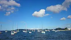 Brisbane Water is a wave-dominated barrier estuary[2] located in the Central Coast region of New South Wales, Australia. Brisbane Water has its origin at the confluence of the Narara and Coorumbine Creeks, to the south–east of Gosford and travels for approximately 18 kilometres (11 mi) in a southerly direction to its mouth at Broken Bay, about 7 kilometres (4.3 mi) from the Tasman Sea, at Barrenjoey Head. A number of towns and suburbs surround the shores of Brisbane Water, including Blackwall, Booker Bay, Davistown, Empire Bay, Erina, Ettalong Beach, Gosford, Green Point, Hardys Bay, Kilcare, Kincumber, Koolewong, Phegans Bay, Point Frederick, Point Clare, Saratoga, Tascott, Wagstaffe, and Woy Woy. Contained within Brisbane Water is St Huberts Island, Rileys Island, Dunmar Island and Pelican Island; and adjoining the estuary is Brisbane Water National Park to the west and Bouddi National Park to the east. Forming part of the same tidal estuary system is a separate but connected basin, the Kincumber Broadwater, lying to the east of Davistown.