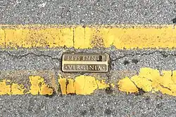 Double yellow line on State Street, separating Virginia from Tennessee with a bronze marker embedded in pavement.