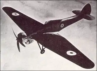 Weight saving was a priority and the airframe, other than the steel tube engine mount and cowling, used a wood shell.[14][2] It with a plywood skin glued to the mahogany longerons and struts that formed the internal structure, which was faired throughout to reduce drag. A conventional fixed undercarriage was used as it was more important to reduce the weight than the drag, and a retractable undercarriage would have been counterproductive.[14] The wings were constructed in three sections with a centre section integral with the fuselage. Three spars with plywood webs and mahogany flanges were used, covered with plywood sheeting.[14]