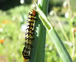 The larvae are aposematically coloured in pale yellows on blacks and browns. They are unpalatable to most vertebrate predators, and also poisonous, feeding as they do, on largely unpalatable and poisonous plants. They are slightly bristly, but the bristles seem to be sensory rather than irritant. Typically they grow to about 40 mm long before pupation.[4]