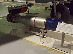 A proposed aerial torpedo for ASW. Dropped with a parachute over the approximate location of a submerged submarine, after splashdown it would move in a circling pattern in order to randomly hit the target. Propulsion was electric, with a speed of approximately 10 kn (19 km/h) and an endurance of 30 minutes. The project was abandoned in 1943.[22] The basic concept of the weapon may have resembled that of the Japanese QR Project spiraling torpedo.