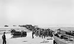 On 10 May 1940, Germany invaded Belgium. In response, the Anglo–French armies moved into Belgium in accordance with the Allied Dyle Plan. The division reached the River Dyle without difficulties. Although tactical success was achieved in its first action on 15 May, strategic developments forced the BEF to withdraw the next day towards the Escaut.[37][38] The 3rd Infantry Brigade provided a rearguard and was attacked on 18 May, was almost cut off but was able to extradite itself with the support of the divisional artillery. A few days later, the division fought back an assault on their position at the Escaut. The British official campaign history alleged that the Germans preceded their attack with troops dressed as civilians or British officers. On 23 May, a further withdrawal took place as the division moved back to defend the western bank of the Lys.[39] Three days later, with the majority of the BEF now bound within a closing perimeter on the French coast and lacking the ability to hold the position, the decision was made to evacuate from Dunkirk, the only remaining port in British hands.[40] By the end of the month, three of the division's battalions were dispatched to reinforce the 5th Infantry Division while the main body of the 1st Infantry Division withdrew into the newly established Dunkirk perimeter. The divisional engineers constructed a makeshift pier from lorries at Bray-Dunes, which became vital once small ships arrived to help with the evacuation. Meanwhile, the division's infantry (alongside the 46th Infantry Division) defended the Canal de Bergues between Bergues and Hoymille. On 31 May/1 June, they were heavily attacked; some positions were retained while others were breached and the troops forced back to the Canal des Chats. During this fighting, Captain Marcus Ervine-Andrews earned the Victoria Cross.[41] By the end of the next day, the division had been evacuated back to the UK.[29] The 1st Battalion, King's Shropshire Light Infantry, provided the division's rearguard and left via the Dunkirk mole on the ferry St Helier, alongside the final remnants of the BEF that had made it to Dunkirk, just prior to midnight. Left within the heavily damaged town, was upwards of 30,000 French soldiers who covered the final stage of British withdrawal.[42]