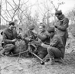 Route 7, a highway and a vital supply line from central Italy to German forces based at the Winter Line, passes through Cisterna di Latina. The town was thus a target of the Allied landing. Carroceto and Aprilia were captured on 25 January, as the division worked to assist VI Corps achieve this goal. Over the course of the following days, patrols were conducted, minor tactical gains were made, and the division fended off several further German counterattacks that saw at least one British company overrun.[69][70][71] While the initial corps-wide attack had failed, a renewed effort began on 30 January after sufficient forces had landed and the corps had secured its logistical base. For the divisions part, it had to advance towards Albano Laziale and Genzano di Roma, with the aim to create conditions for the US 1st Armored Division to exploit potentially towards Rome. While the division reached Campoleone, it was unable to push beyond, and the US tanks failed to make their own impact due to mud and terrain limitations. The division regrouped to consolidate the ground captured, a salient 7,000 yards (6,400 m) deep.[72][73][74] By early February, the Germans had assembled a force that was almost on parity with the Allied forces in the bridgehead. On the division's front, between 3–4 February, German efforts concentrated on destroying the salient. Due to terrain, some the division's units were not able to set up mutually supporting positions and this was exploited by the German who infiltrated between them. While some of the initial German attacks were fought back, some British positions were overrun, or the troops forced to fall back. By the end of 4 February, the German assault had forced the division back to the positions held on 30 January and had inflicted 1,400 casualties.[75][76][77] Further German attacks steadily gained ground and by the end of 10 February, Aprilia and Carroceto had also been lost by the division.[78] It then moved into reserve. During this period, the divisional commander Major-General Ronald Penney was wounded necessitating several days away.[29][79][80]