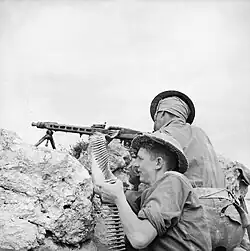 The division arrived in North Africa on 9 March 1943 and moved to the Medjez-Bou Arada area of Tunisia. It joined the ongoing Tunisian campaign, by conducting patrols over the following weeks.[29][51] On 4 April, it was temporarily redesignated as the 1st British Infantry Division, to avoid confusion with the US 1st Infantry Division that was also active in the campaign.[52] Generaloberst Hans-Jürgen von Arnim, commander of the Axis Panzer Army Africa, was aware that Allied forces were intending to launch a major offensive. To attempt to cause delays, he approved for the Division Hermann Göring and the 334th Infantry Division to attack, supported by the 10th Panzer Division and Tiger I tanks. On 21 April, six German battalions attacked the British 1st and the 4th Divisions near Medjez el Bab. The 3rd Brigade, holding a ridgeline nicknamed 'Banana Ridge', bore the brunt of the attack in the division's sector. While the German assault caused a potentially dangerous situation to arise for artillery that had been moved forward in preparation for the Allied offensive, it was repulsed with just 106 casualties among the 1st Division. Thirty-three German tanks and 450 prisoners were claimed. The next morning, Operation Vulcan began, which was intended to be the final Allied effort in the Tunisian campaign and to capture Tunis.[53][54]