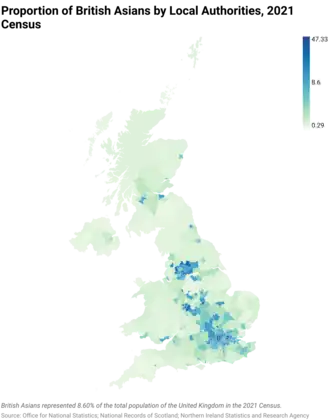 ![]() Asian/Asian British population percentage across the United Kingdom in 2011 | |