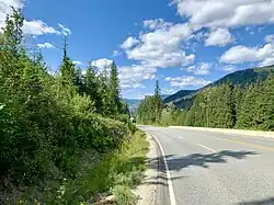 Highway 6 is a two-lane highway passing between the Kootenay and Okanagan regions in the province of British Columbia, Canada. It is divided into two parts—the Nelson-Nelway Highway between the Canada–United States border and Nelson, and the Vernon-Slocan Highway between South Slocan and Vernon.[2][3] Highway 6 is a north–south highway between Nelway and the Needles Ferry and an east–west highway between the Needles Ferry and Vernon;[4] it has a total length of 407 km (253 mi).[1] It first opened in 1941 and, aside from minor realignments along its concurrences with 3 and 3A, its very winding path through the western Kootenays has not changed since.