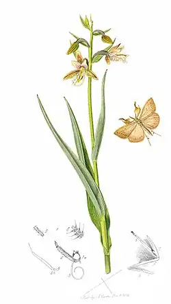 Proof impression: Plate 527, marsh fan-foot (Pyralis cribralis) with marsh helleborine (Epipactis palustris)