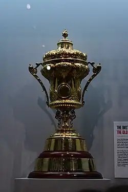 The Mervyn O'Gorman trophy was an old Brooklands trophy, last awarded in 1909, which was donated by Mervyn O'Gorman to the RAC in April 1950,[8] following the failure of the Brooklands race track to reopen after the Second World War. The last time this trophy was presented was at the 1972 British Grand Prix at Brands Hatch,[9] with the Royal Automobile Club Trophy first awarded at the 1973 British Grand Prix at Silverstone the following year[6] and was first pictured in the official event programme in 1974.[7]