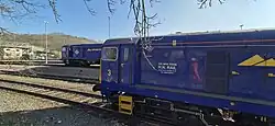 HNRC Class 20s on long-term hire to Corus were painted in Corus livery; previously silver but currently a bright yellow with red solebar (No.81 – 20 056). Since the Corus business was bought by the Indian Tata Steel group, some of these locomotives have been repainted into Tata Blue livery (No.82 – 20 066). Two HNRC Class 20s were painted into GBRf Europorte's blue and gold livery (20 901 and 20 905) prior to being sold to Balfour Beatty in 2024,[14] while two other HNRC Class 20s have been painted in the blue livery of Breedon; No.2 – 20 168 "Sir George Earle" and No.3 – 20 906 and are on long-term hire at Hope Cement Works.[19]
