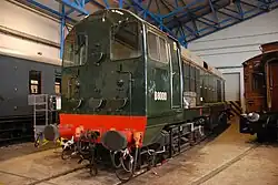 D8000 was delivered in June 1957 in overall green livery, with grey footplate,[6] red bufferbeams and a grey roof extending down the bodyside to the edge of the roof panels.[15] The original batch of 10 locos bore the BR crest facing towards the nose on both sides, used yellow sans serif numerals, and had green cab roofs; locos from D8010 had the correct pattern BR crest, white numerals and grey cab roof. This was adjusted after D8103[6] to include a small yellow warning panel, although the precise size and detail of such panels varied somewhat.[4]
