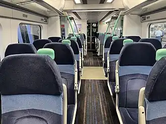 Each six-car train is fitted with 340 seats in 2+2 formation, all standard class, with an additional twelve tip-up priority seats located in an indicated wheelchair area near the vestibules of the DPT1 vehicle.[6] There is no separation between the vestibules and the main interior save for wind shields.[80] There are two toilets per unit, one of which is larger and designed to be universally accessible.[5][81][82] The seats are mostly arranged 'airline' style, though there are also a small number of table seats present in each car.[6] Nearly all seats feature flip-down tables and coat hooks, while a single electrical socket has been provided for each pair of seats. The interior design and layout is in conformance with the Rail Vehicle Accessibility Regulations 2010.[80]