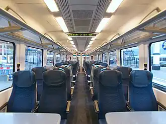 South Western Railway has conducted a refurbishment programme under its contract from 2017 onwards. As part of this work, every unit has been deep cleaned, and the carpets and seat covers in standard class have been replaced. In addition, plug sockets have been provided at every pair of seats, and the guard's office and buffet unit in the accessible carriage have been removed to provide extra seats. First class has been reduced from 35 seats to 32, and the 2+1 seating has been replaced with 2+2 seating, with leather seats and new tables providing facilities for wireless charging.[18]
