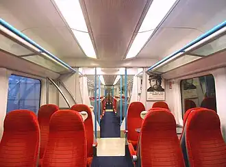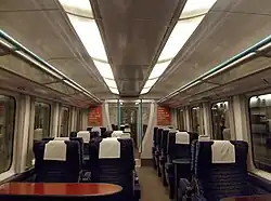 Additional modifications included re-gearing the traction motors to reduce the train's maximum speed from 100 mph (161 km/h) to 75 mph (121 km/h), both to reduce the likelihood of overheating when making frequent stops and starts, and because the higher speed was unnecessary on suburban services in any case.[13] New Train Management System (TMS) software was developed to be compatible across the entire Class 458/5 fleet, simplifying maintenance and improving reliability.[7] An Automatic Selective Door Opening (ASDO) system was installed for use at a small number of stations where it was impractical to lengthen platforms.[16] The vehicle interiors were refurbished and reconfigured as standard-class only, with 4-abreast seating and a wider aisle throughout.[7][16] The units were also repainted into SWT's blue livery, matching the Class 450 fleet.