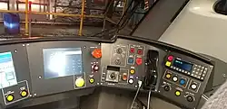 The interior of Class 720 features a 3+2 seating arrangement. These seats are intentionally cantilevered above the floor to provide greater under-seat space for storing personal luggage as well as to ease cleaning.[17] Furthermore, various amenities are present for the convenience and comfort of the travelling public. Each car benefits from air conditioning throughout, while numerous passenger information systems, displaying passenger loading indicators among other information, are present across each carriage's interior.[14] Every seat is provided with its own seat-back table and power sockets, while on-train Wi-Fi enables online connectivity throughout the journey. Onboard toilet facilities are also present.[14] Akin to trains operated by the London Overground, the Class 720s have through gangways to encourage passengers to spread out across the train.[14] The interior is also fully compliant with the Technical Specification for Interoperability for Persons of Reduced Mobility, featuring dedicated spaces for wheelchairs, as well as spaces for bicycles. One of the two toilets present in a five-car formation is also outfitted for greater accessibility.[13]