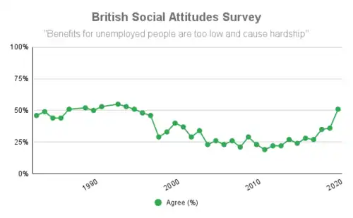 From 1983 until the late 1990s, most people thought that benefits for the unemployed were too low and caused hardship. Following the election of the Labour government in 1997, there was a sharp decline in this view and the majority of people now believed that unemployment benefit was too high until 2016, when an increasing number of people began to consider unemployment benefits as too low and the proportion of people holding this view reached a twenty five year high of 51% in 2020.[6]