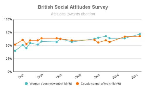 The proportion of people who believe abortion should be allowed if a woman does not want a child has increased gradually during the period from 1983 to 2016, from 40% in 1983 to 72% in 2016. Similarly an increasing number of people believe abortion should be allowed if a couple cannot afford a child, which reached a high of 68% in 2016. Over 90% of people have consistently believed that abortion is acceptable if the pregnancy is a result of rape.[4]