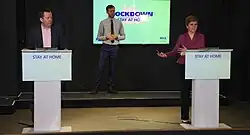 The stay-at-home order was announced by the Prime Minister, Boris Johnson, in a television broadcast. It was initially expected to last at least three weeks, superseding the government's guidance for the public to go about their normal lives while remembering to wash their hands thoroughly.[70] The "Stay Home" slogan appeared on the lecterns that speakers stood behind at the press conferences. It was often seen in capital letters, on a yellow background, with a red and yellow tape border. The government commissioned and broadcast millions of radio, television,[70] newspaper and social media adverts. These were often accompanied by photographs of healthcare workers wearing personal protective equipment, including face masks.[71]