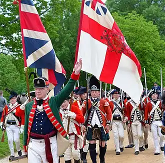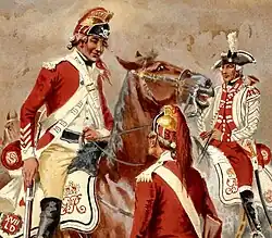 To identify the numerous regiments from one another the colours of the facings on the dress would have differed to reflect the regimental colours. For example, the 24th Regiment of Foot used "Willow Green" facings "lined with white", while the 33rd Regiment of Foot used red facings with a "white lining".[47] Another way the units were distinguished from one another was the use of flags (colours). As the War Office document WO 26/21 stated, "The Camp Colours to be the Colour of the Facing of the Reg with the Rank of the Reg in the center, those of the Horse to be square, and those of the Dragoon Guards, or Dragoons, to be swallow-tailed".[48]