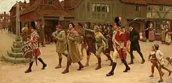 According to Samuel Johnson's Dictionary of the English Language, the term "redcoat" was a derogatory one, used as a "name of contempt for a soldier" with the word "soldier" itself being described as "one who serves for pay".[61] In the American colonies the term "lobster" was applied to the redcoat soldier. The public perception of private soldiers varied with the times, they could be seen paradoxically as both subservient and destitute individuals[62] while also being widely commemorated in times of victory and war.[63] Patriotic parades and celebrations often included regular army units, the militia or local volunteer regiments, and were an important component of civic ceremony and pride. It must be recognised that although questions did arise as to the need for a standing force, when fears of an invasion were widespread, the speed with which the government was able to utilise its militia and volunteer forces suggests how "the unreformed British state rested on the active consent of substantial numbers of its inhabitants".[64] The public perception of the British Army gradually changed as the long war with Revolutionary/Imperial France wore on, contributing to the Duke of York's structural, recruitment and training reforms in the early 1800s.