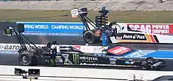 Force became an NHRA drag racer in 2013, driving a Top Fuel dragster, the first John Force Racing driver to compete in that class.[2] She is sponsored by Monster Energy.[3] In 2016, she became the first woman to win the NHRA Four-Wide Nationals.[4] On May 20, 2016, she set a new NHRA top fuel drag racing record with a run of 3.676 seconds over 1,000 feet at Heartland Park Topeka, Kansas.[5]