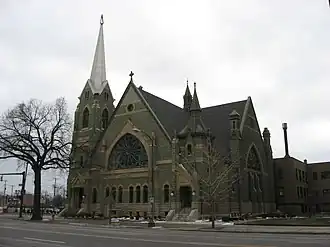 Broad Street has been one of Columbus's two main corridors since its founding, along with High Street, meeting at a 100 percent corner downtown.[2] The street has its origin before High Street and Columbus, with the 1797 founding of Franklinton. The first section of the road was constructed then, on the west bank of the Scioto River. Franklinton, then an independent settlement, had applied to be Ohio's capital. The settlement's founders were persuasive, though its flood problem led Ohio officials to choose the eastern bank of the river, on higher ground. Several streets were then laid out from the city's founding in 1812 into the following year, including Broad and High.[3] These streets and the entire grid were laid out 12 degrees off from a north–south and east–west alignment.[4] Broad Street's construction involved clearing dense forest, and tree stumps left behind caused horse-drawn carriages to maneuver around them, helping lead to the wide roadway.[3]