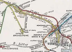 From basic beginnings around the Dublin terminus serving the basic of the newly created railway in the late 1840s the works had grown and become cramped by 1869/70.[2] The works were extended in 1877 allowing space for locomotive building and assembly with No. 49, Marquis being the first built there in 1879.[2][3] A further 119 engines were built or constructed at Broadstone until the MGWR's amalgamation to form Great Southern Railways (GSR) in 1925.[3] The GSR's Inchicore works was expanded with a new erecting shop and from 1928 the assembly of the GSR Class 372 2-6-0 Woolwich Moguls was switched from Broadstone.[4] Engineering work was thereafter switched from Broadstone, with the works and station closing in the 1930s but with the steam locomotive depot remaining active until 1961.[5] The wagon works resumed wagon building after a gap in 1950, with over one hundred cattle trucks constructed.[6]