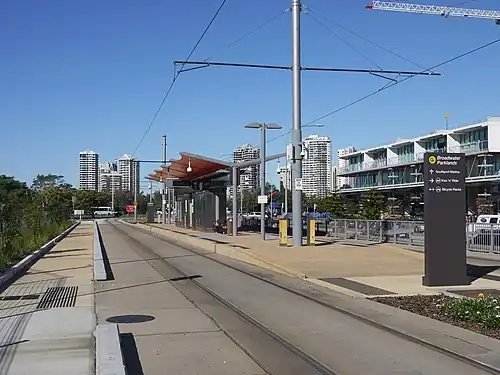 Broadwater Parklands light rail station is located on Queen Street in the Gold Coast suburb of Southport. The station is part of the Gold Coast G:link[1] light rail system and provides direct access to Southport Broadwater Parklands, a large community park situated on the Gold Coast Broadwater.
