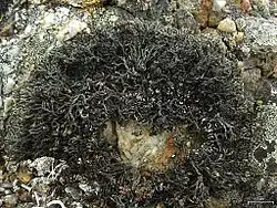 Brodoa oroarctica, commonly known as the Arctic sausage lichen, mountain sausage lichen, or rockgrub, is a species of rock-dwelling, foliose lichen in the family Parmeliaceae.[3] First described in 1974 by the Norwegian botanist Hildur Krog, it is characterised by its dark grey, irregularly spreading thallus with narrow cylindrical lobes that grow loosely attached to rock surfaces. The species has a primarily circumpolar distribution across Arctic regions of the Northern Hemisphere, extending southward along the Rocky Mountains in North America, with notable disjunct populations in the White Mountains of New Hampshire, the Adirondack Mountains of New York, and the island of Newfoundland. It is distinguished from related species by its chemical composition, containing atranorin and physodic acid, and its preference for exposed Arctic–alpine habitats with limited snow cover. While common in its main Arctic range, its isolated southern populations are of conservation interest due to their rarity and potential vulnerability to climate change.