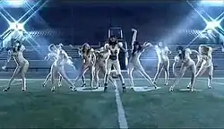 The music video for "Broken Heels" was filmed in Los Angeles on 22 and 23 November 2009, as confirmed by Burke's official Twitter page. It was choreographed by Frank Gatson and JaQuel Knight, who have also worked with Beyoncé. The music video consists of Burke and several female dancers. It premiered on UK music video channel The Box 11 December 2009, playing hourly. It received positive reaction from Nick Levine of Digital Spy who noted that: "It's essentially a massive tum-flashing, tush-shaking dance routine set in the middle of an American football pitch."[16] The video begins with Burke singing into a mirror in a locker room, with a team of female American football players getting ready behind. Interspersed are shots of male players doing the same. The next scene shows the two teams emerging from the stadium tunnels. Burke and the female team then begin a dance routine, which is occasionally interrupted to show shots of Burke in a green-lit tunnel. Throughout the video Burke is seen wearing two different outfits; a #17 full length leotard and a #18 crop top midriff-baring outfit. Burke said that "[the video is] going to show people that no matter what your shape, colour, size, whatever you are, you are still beautiful."