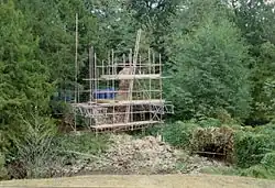 The remains indicate that the manor house was four-sided, with corner and mid-wall tower fortifications.[3] There is an extant moat that surrounds the castle, spanned by a late 19th century bridge.[1] Cracking to the gatehouse tower was noticed in 1990, and during the erection of scaffolding for consolidation works in 1991, much of the tower collapsed into the moat.[2]