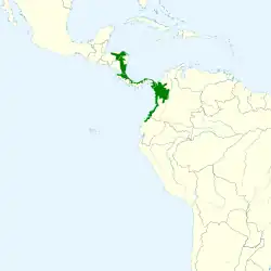 Subspecies C. u. melanorrhoa of the bronze-tailed plumeleteer is the northernmost. It is found from eastern Nicaragua into Costa Rica and has a few records in eastern Honduras. C. u. isaurae is found on the Caribbean slope and locally on the Pacific slope of Panama and into extreme northwestern Colombia. The nominate is found from eastern Panama's Darién Province through north-central and western Colombia into northwestern Ecuador. The species inhabits the interior and edges of humid forest, mature secondary forest, and semi-open landscapes such as banana plantations and gardens. It shuns open areas. In elevation, it ranges from sea level to 700 m (2,300 ft) in Costa Rica and up to 900 m (3,000 ft) in Colombia.[12][13]
